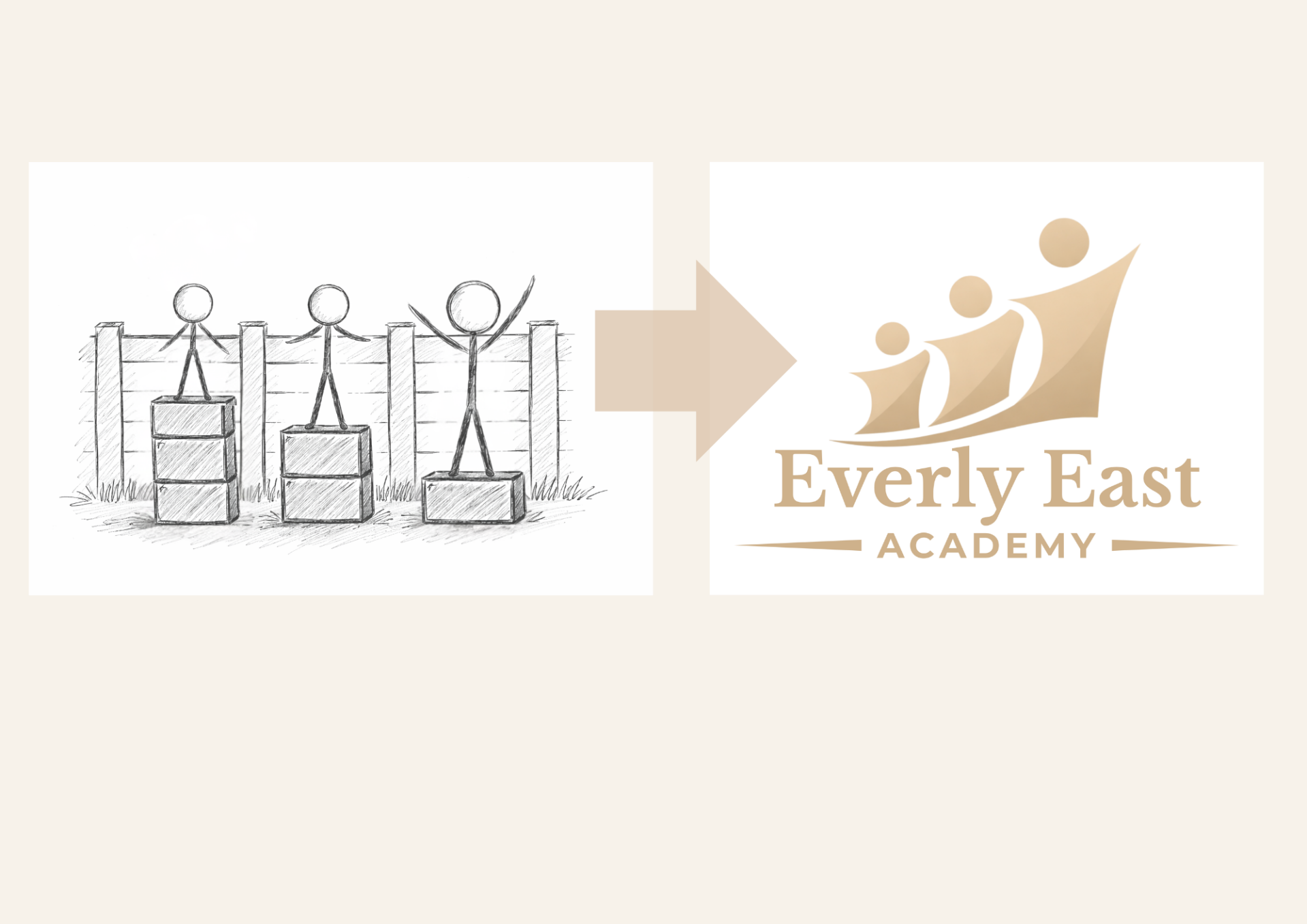 The Everly East Academy logo represents the values and philosophy that sit at the heart of our school. The concept for the logo originated from a simple drawing created by one of the school’s directors and Headteacher, Jack Beech. In the drawing, three stick figures were shown standing on different numbers of boxes. One figure stood on three boxes, another on two, and another on none.